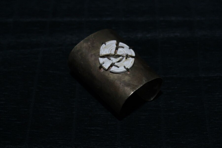 Этот браслет выполнен из металлического листа, по эскизу 1:1 была вырезана основа, после чего на наковальне с помощью различных инструментов я придала ему нужную текстуру