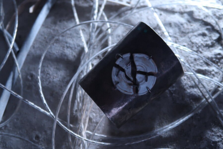 Керамические шляпки, хаотично «утопленные» в металл, нарушают его идеальную поверхность. А большой центральный винт — визуально будто стягивает форму. Кольца выступают метафорой о том, что иногда то, что кажется уязвимым, держит на себе всю конструкцию