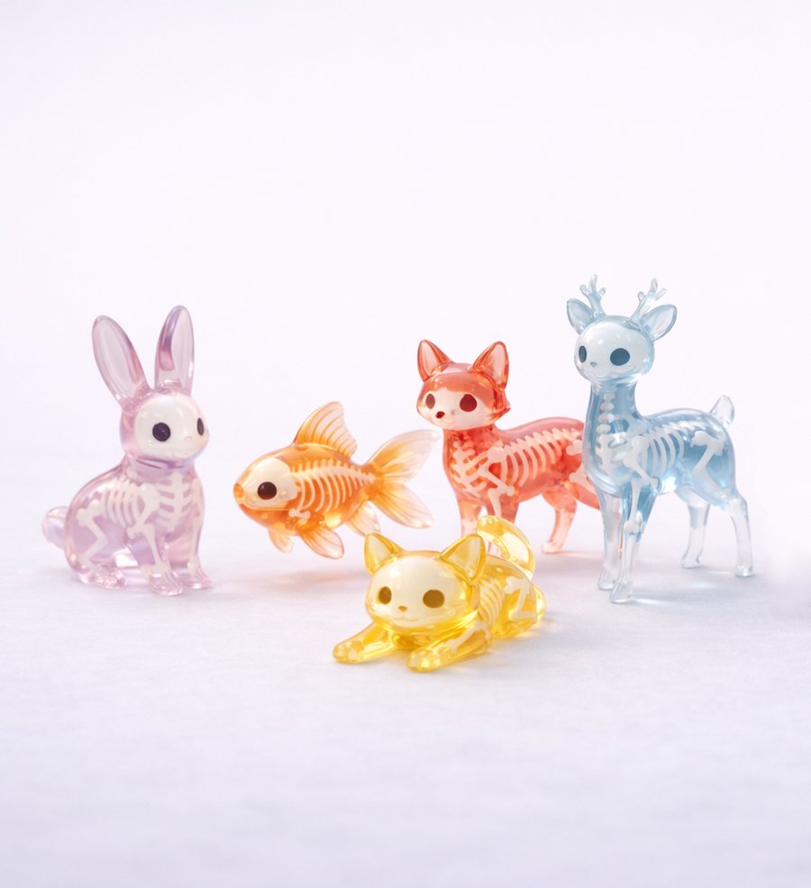 Проект представляет собой серию/коллекцию декоративных 3D-объектов. В основе коллекции лежит образ прозрачного тела животного с видимым внутренним скелетом. При этом формы намеренно упрощены и сделаны мягкими, почти игрушечными. Фигурки лишены индивидуализированных черт, что позволяет воспринимать их не как конкретных персонажей, а как универсальные образы, в которых каждый может найти собственные ассоциации.