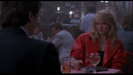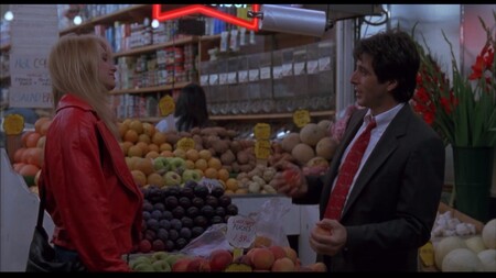 «Море любви» (реж. Харольд Беккер, 1989) Герой Аля Пачино — полицейский, который ловит убийцу «на живца». Для этого он проводит встречи с девушками, откликнувшимися на объявление о знакомстве в газете. Среди них героиня Эллен Баркин. Она появляется в ярко коралловой куртке и явно «зацепляет» главного героя (и зрителей тоже, надо сказать). На втором кадре красный галстук на Пачино явно говорит о том, что между героями пробежала искра.