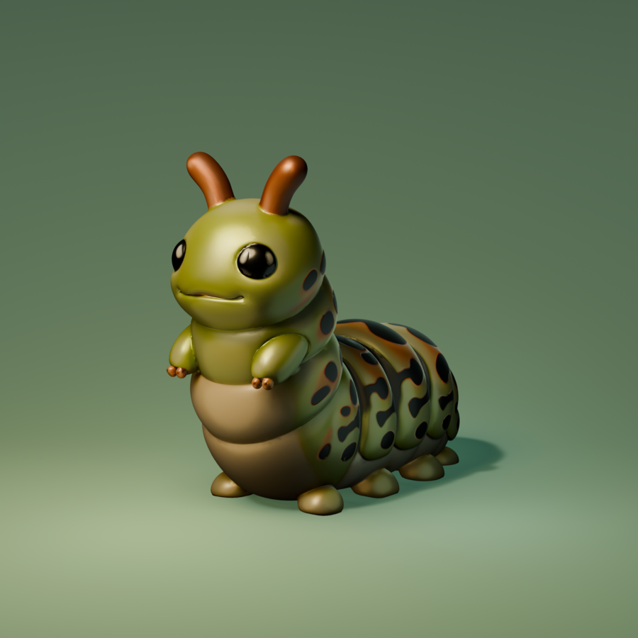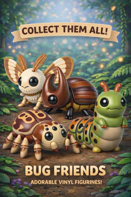 Серия из 5 стилизованных 3D-фигурок, вдохновлённых насекомыми: жук-носорог, мотылёк, гусеница, паук и божья коровка. Объекты объединены единой визуальной эстетикой. Визуал ориентирован на коллекционные фигурки и предметный дизайн: каждая модель — компактная, «дружелюбная» форма, хорошо читаемая в небольшом масштабе и пригодная для массового производства 3D-печатью.