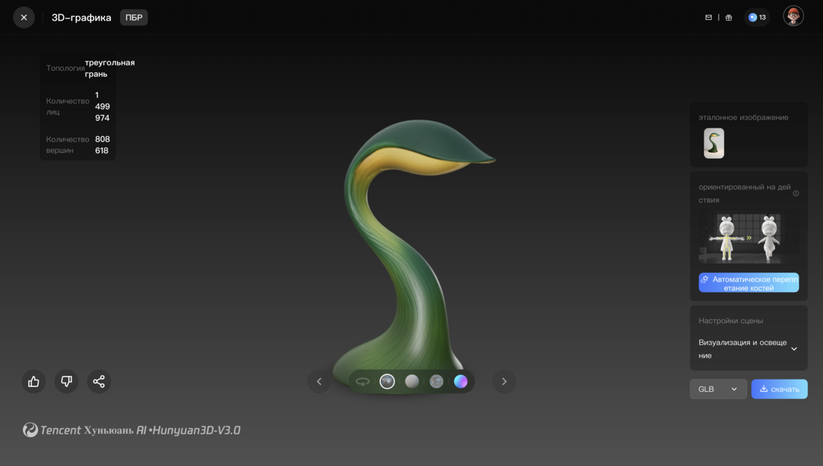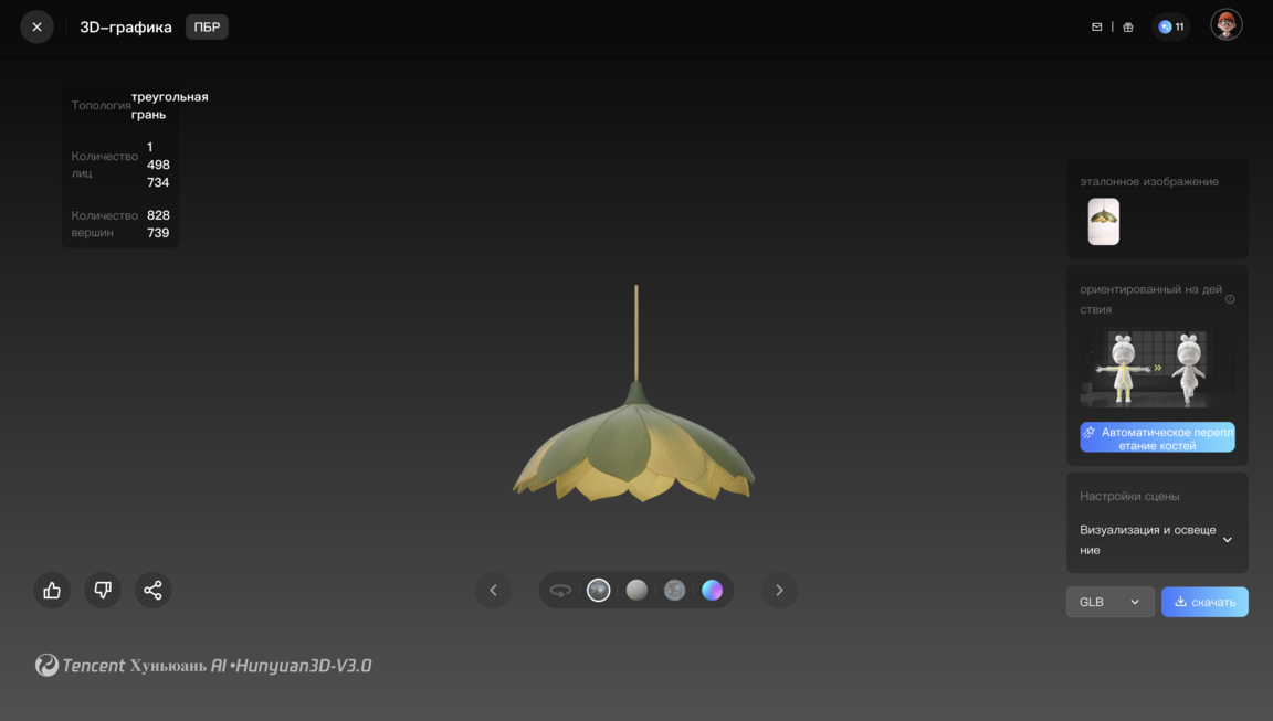 Для получения объёмных моделей я использовала сервис https://3d.hunyuan.tencent.com/, который позволил автоматически сгенерировать базовые 3D-модели на основе изображений.