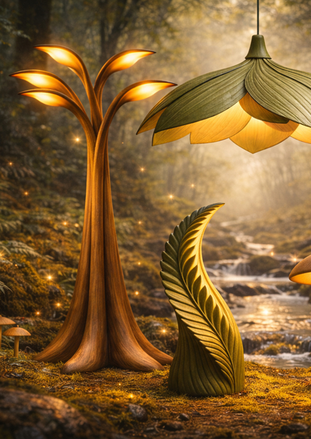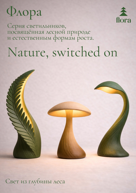 Серия интерьерных светильников, вдохновлённых формами леса: ростом растений, изгибами ветвей, грибами, листьями, мхом. Каждый объект — будто живой организм, выросший из одной почвы.