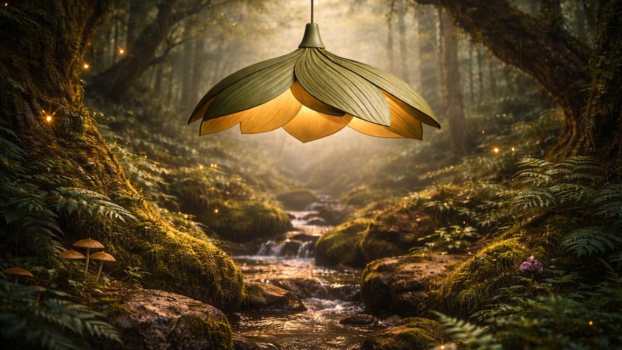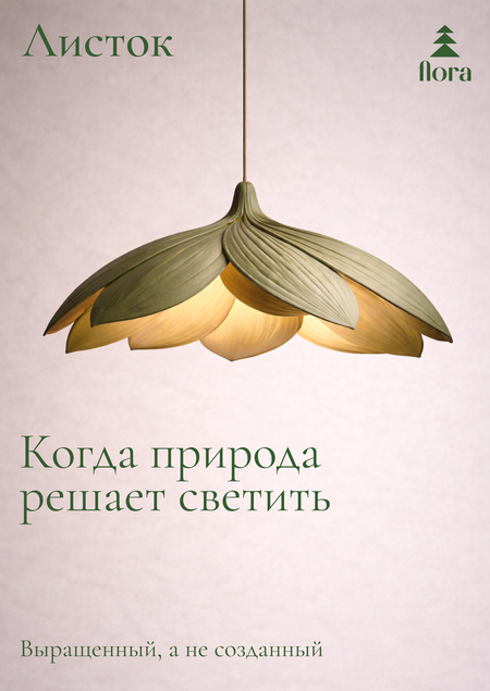 Подвесной светильник выполнен в виде плавно изогнутой формы, напоминающей нависающую крону дерева или лист, пойманный в моменте движения. Лёгкость конструкции и мягкий контур создают ощущение парения, а направленный вниз свет формирует комфортное и естественное освещение, подобное рассеянному свету под пологом леса.