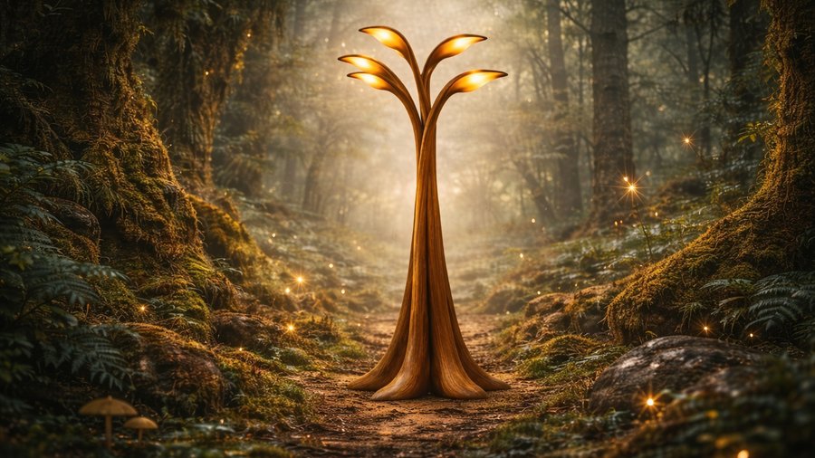 organic forest-inspired table lamp placed on a wooden desk in a calm modern interior, warm evening light, soft shadows on the wall, natural materials around: wood, linen, clay, the lamp looks like a living sprout growing from the surface, cozy Scandinavian, realistic lighting, lifestyle product photography, depth of field, cinematic mood, format 16:9