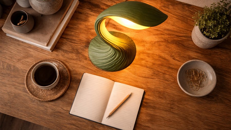 Особенности формы: Форма построена на плавном S-образном изгибе, напоминающем росток, пробивающийся из почвы. Основание широкое и устойчивое, постепенно сужающееся кверху. По корпусу — мягкие продольные рёбра, подчёркивающие направление роста. Верхняя часть вытянута и нависает над источником света, формируя естественный световой козырёк. Внутренняя полость предназначена для установки LED-модуля или лампы с рассеивателем.