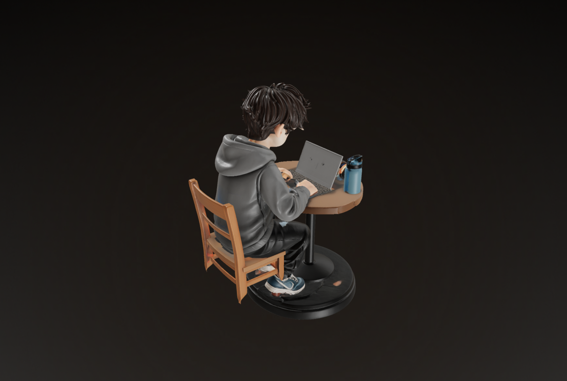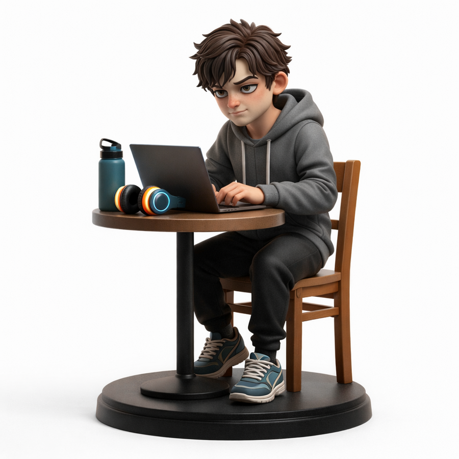 Символический атрибут: ноутбук и наушники — символы цифровой независимости.