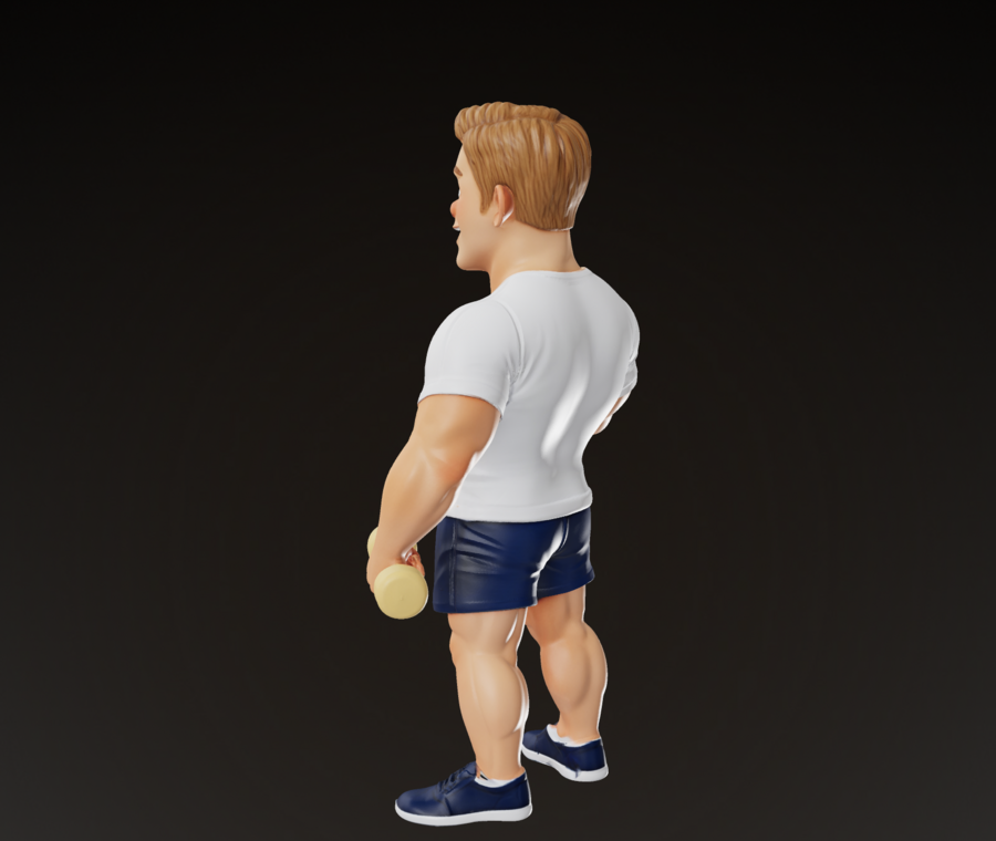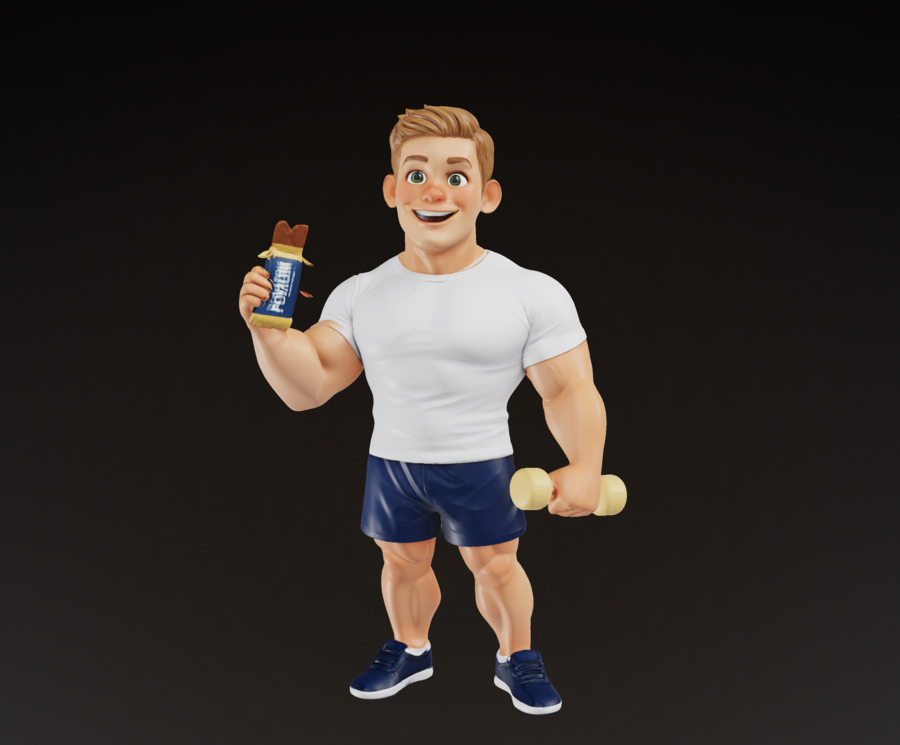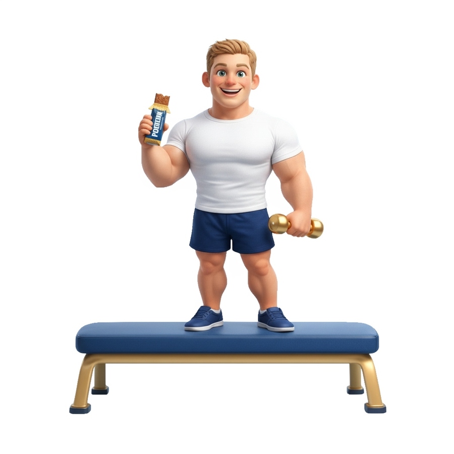 Символический атрибут: протеиновый батончик и гантеля — намёк на любовь к спорту.