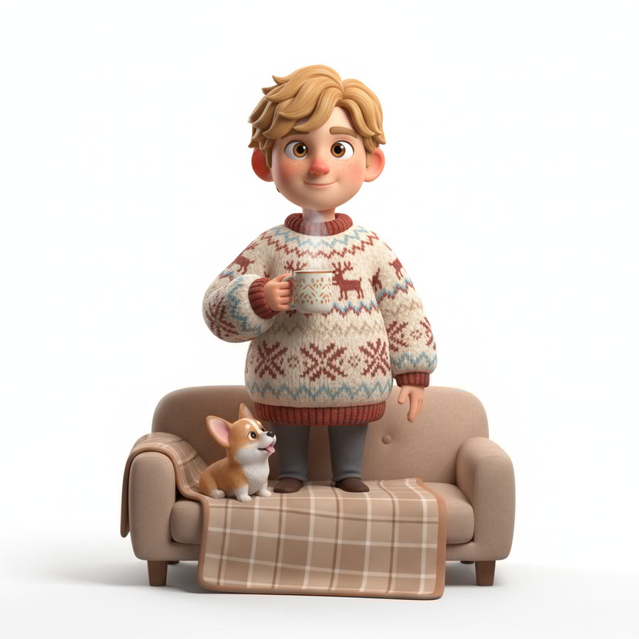 Визуальные маркеры: мягкая улыбка, распахнутый взгляд, уютная одежда (свитер с оленями).