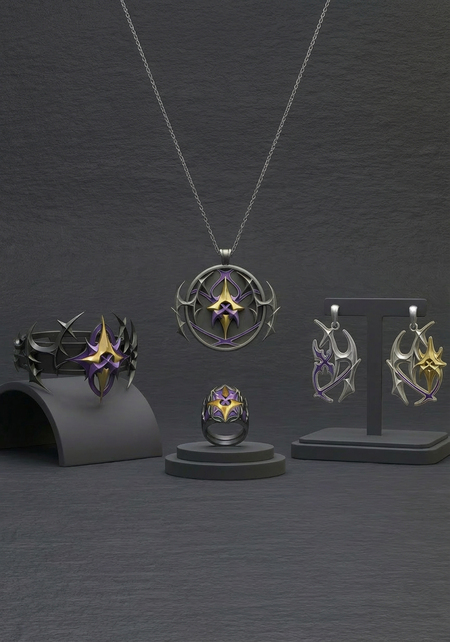 Transform the provided logo into a jewelry design sketch intended strictly as a reference for 3D modeling and CAD production. Design a high-end pair of earrings with a solid, unified construction. Left earring should contain the left letter H and the golden star, the right earring should containt the purple letter X and the right H. Material layers: — Yellow gold: the central star-shaped emblem, sculpted as a raised solid element. — Purple enamel: the X-shaped core and all thin connecting lines, set into recessed enamel channels. — Blackened silver: a continuous base plate forming the main pendant body, the surrounding frame, wing-like extensions, and the integrated bail. Design constraints: — All decorative elements are physically connected and seated onto the blackened silver base plate; no floating or detached elements. — The bail is structurally integrated into the top of the base plate, engineered as a functional attachment point for a chain. — Clear depth hierarchy: base plate → enamel inlays → raised gold emblem. Preserve the original symmetry and sharp ornamental geometry of the logo, translating it into solid, manufacturable three-dimensional forms. Emphasize clean topology, consistent wall thickness, precise edges, and realistic undercuts suitable for casting and CNC. High-detail 3D jewelry design sketch, front-oriented with slight perspective, neutral dark background, studio lighting, CAD-friendly reference, no painterly or illustrative effects.