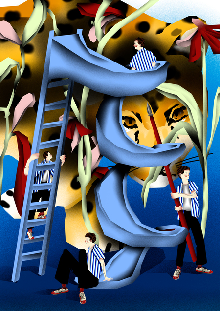 Я разработала его визуальный образ — дерзкий, угловатый, с яркой полосатой рубашкой — и использовала его в разных сценах, отражающих ключевые метафоры и идеи интервью.