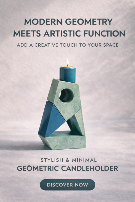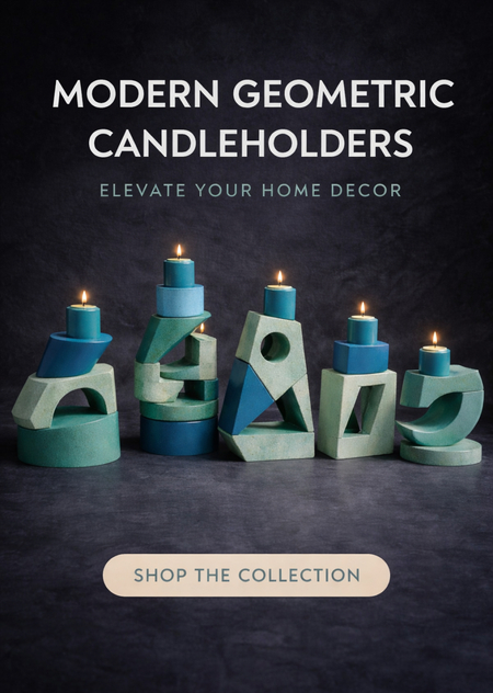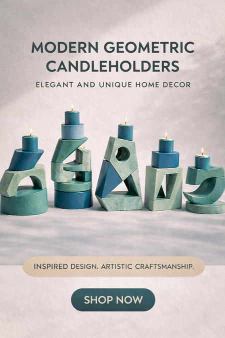 Промт: A cohesive design series of five asymmetrical candle holders based on a single geometric principle, each piece having a distinct, non-symmetrical shape and proportion, with varying heights and cut-outs, made of ceramic and stone materials, featuring green and blue color tones, modern sculptural product design, unified collection, high-quality 3D renders, soft studio lighting