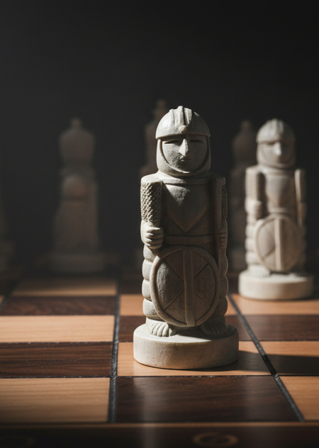 Древний набор шахматных фигур, выточенных из живого камня забытой крепости. Каждая фигура — стойкий страж, воин или рыцарь, с массивными, монолитными формами и средневековой символикой, несущая следы времени и сражений.