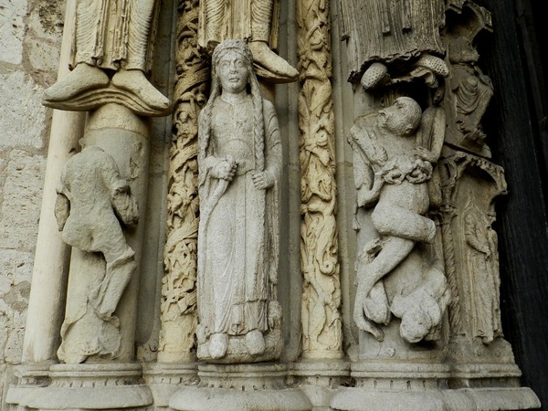 Скульптура Шартрского собора отлепляется от стены, но это всё ещё не отдельная статуя, стоящая в храме — это архитектурная часть стены. Вытянутые фигуры также олицетворяют стремление собора расти вверх — они становятся продолжением колонн, как столпы христианской веры.