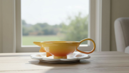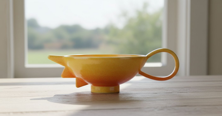 4.2. Кружка «Солнце» Высота: ~80 мм Внутренняя форма: цилиндр Наружная форма: стилизованное солнце Декор: выпуклые элементы (лучи солнца) Ручка: интегрирована в форму стандартная толщина Назначение: чай