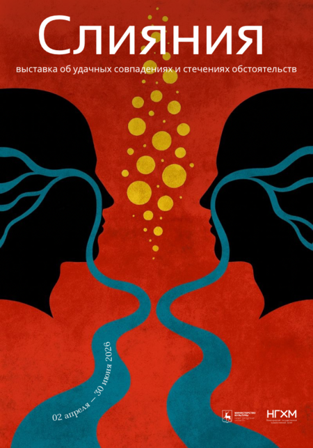 2. Плакат построен на образе двух человеческих профилей, обращённых друг к другу, как метафоре встречи людей, идей и судеб. Из силуэтов выходят реки, которые снизу сойдутся в единый поток, отсылая к слиянию Волги и Оки и к совпадениям человеческих траекторий, формирующих культуру и науку города