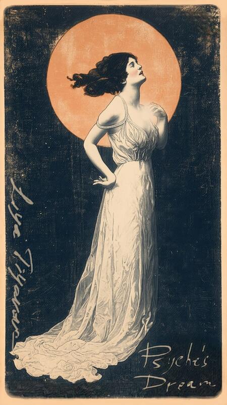 Сон Психеи — размышление о любви и самообмане в форме античной сказки, в которой смешались сон, танец в духе Айседоры Дункан, музыка с инструментами античности, совместная работа театральной бутафории и ии-арта. В основу сценария взят личный дневник драматурга Дарьи Валеевой, который авторы сравнили с древнегреческим мифом об Эроте и Психее. Это высказывание о личной боли и размышление об иллюзиях, которые строят многие влюбленные, буквально воображая отношения — в социуме, это явление называется «делюженшип».