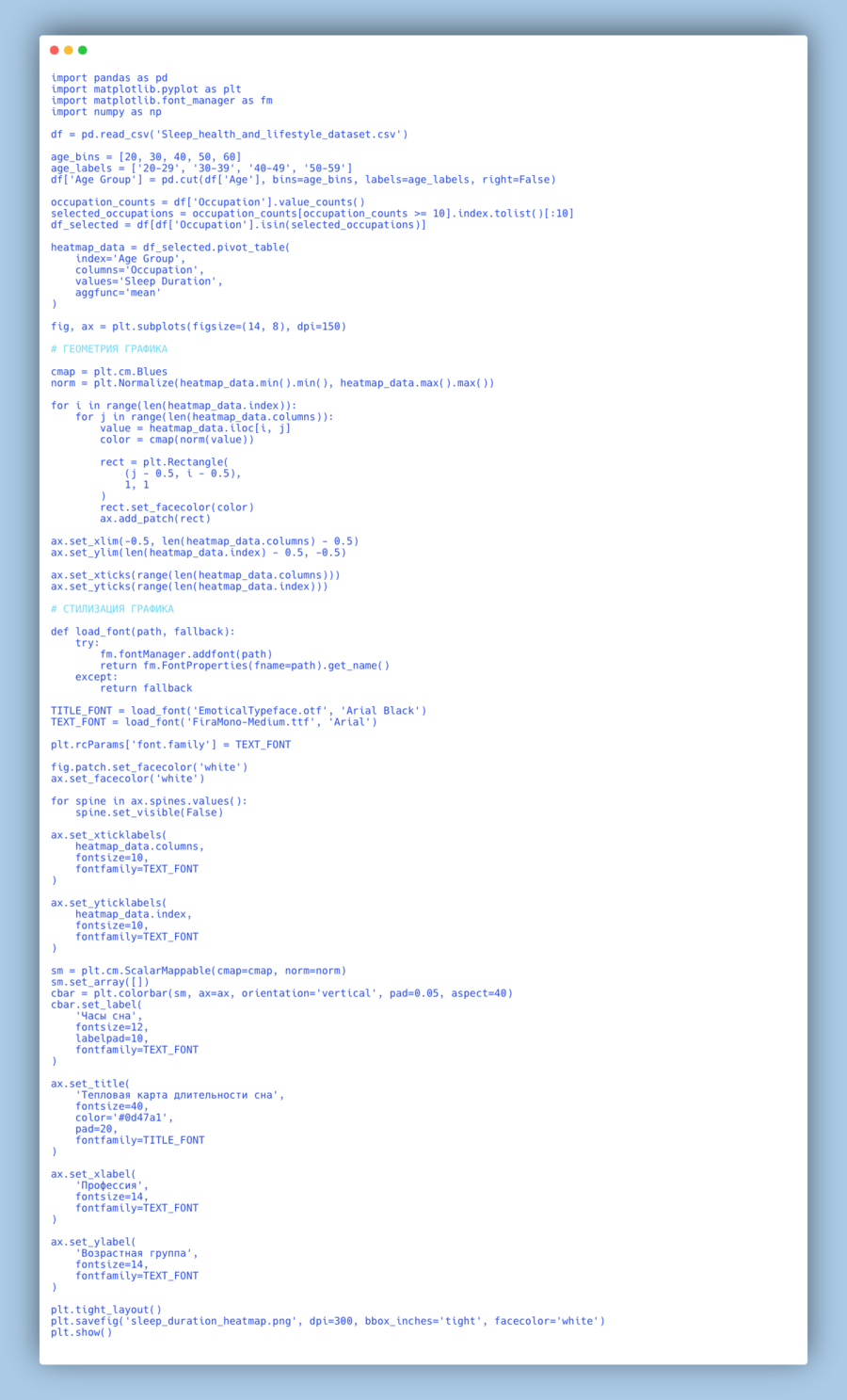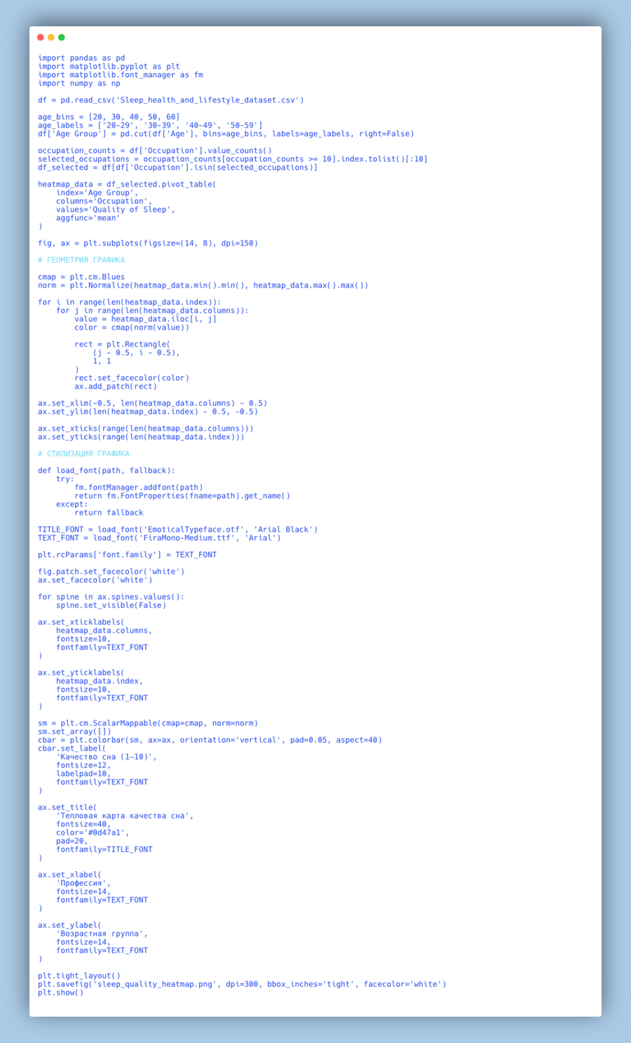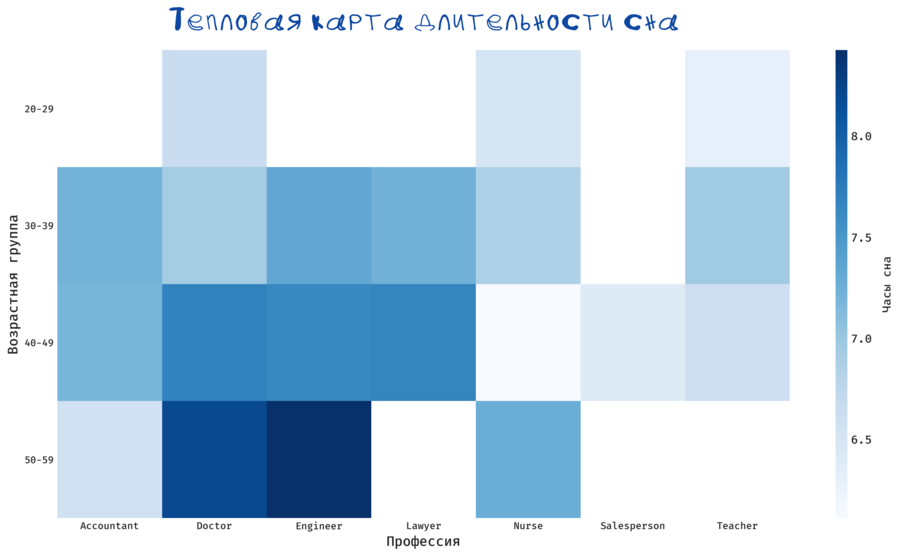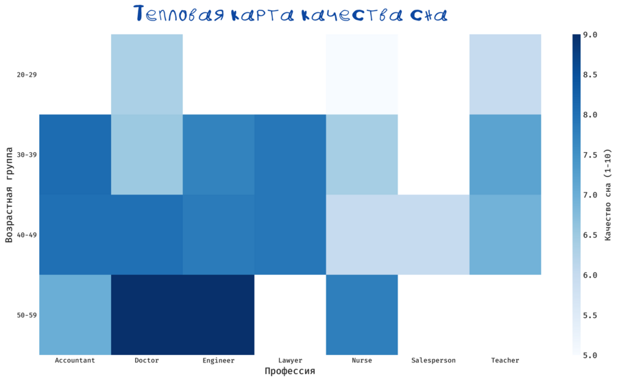 Визуализация основана на методах описательной статистики и сравнительного анализа средних значений. Данные агрегированы по двум категориальным признакам — возрастной группе и профессии, а интенсивность цвета отражает величину количественного показателя.