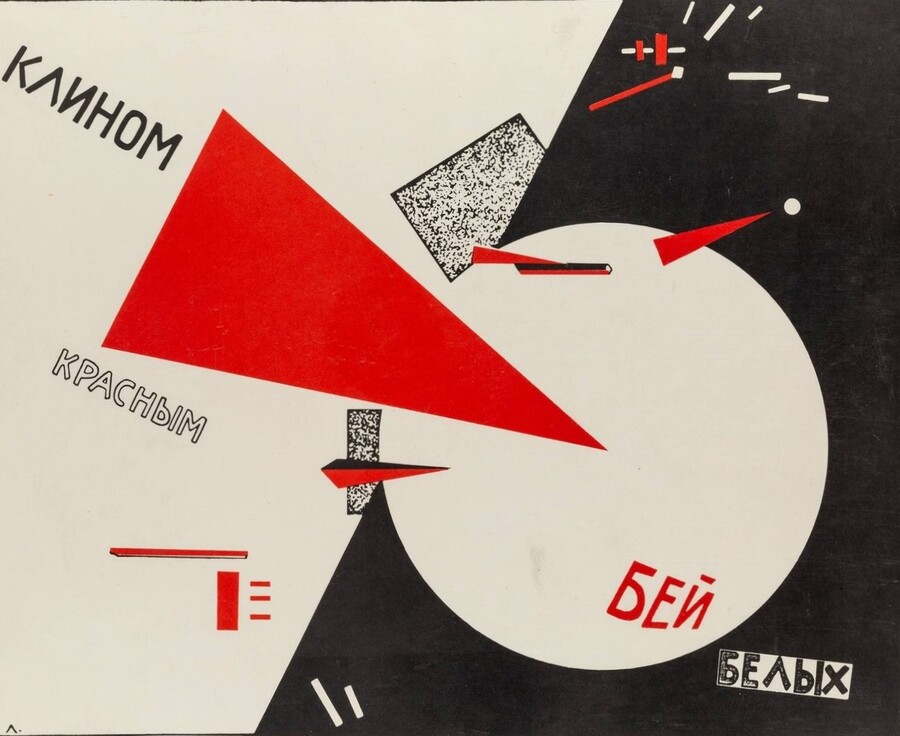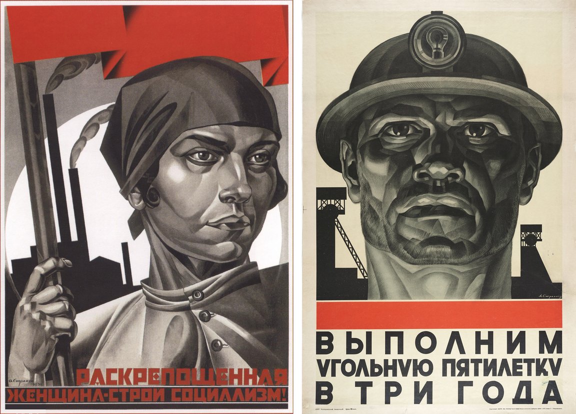Плакат Л. Лисицкого «Клином красным бей белых» (1920); Плакаты А. Страхова «Раскрепощенная женщина, строй социализм» (1926) и «Выполним угольную пятилетку за три года» (1931)
