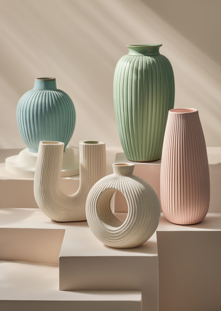 Формы строятся на мягкой геометрии и повторяющемся рельефе, создающем ощущение спокойного движения и телесной логики. Вазы воспринимаются как цельные объекты, побуждающие рассматривать их со всех сторон и взаимодействовать с ними не только функционально, но и визуально.