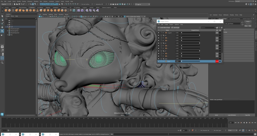 ▸ В разделе Sculpting есть быстрый доступ к Shape Editor. ▸ На одну геометрию существует один блендшейп с несколькими таргетами. ▸ Готовым блендшейпам можно задавать значения не только от 0 до 1, но и за их пределами. ▸ Блендшейп можно править, если кнопка Edit — красная. ▸ Alt + 1 — отключает и возвращает отображение контролов.