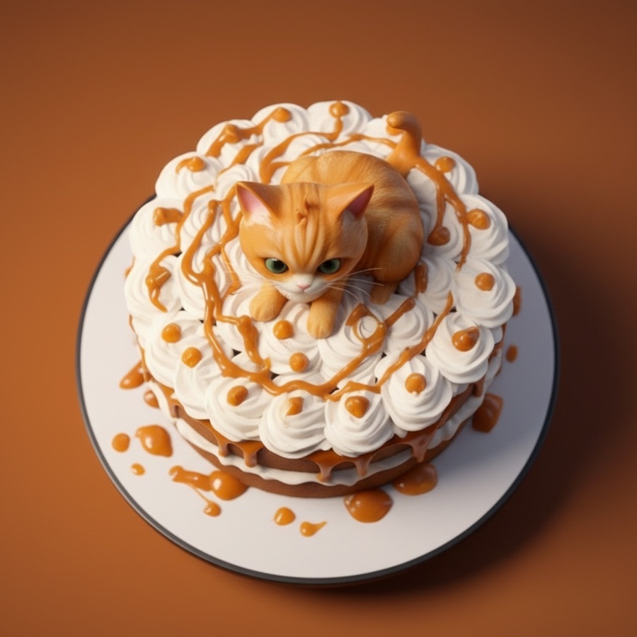 3. Описание объекта: Модель представляет собой круглый торт с декоративной глазурью и морожеными частями, на котором расположена детализированная фигурка котенка. - Общий диаметр торта: ±150 мм - Высота торта: ±80 мм - Высота котенка: около 50 мм