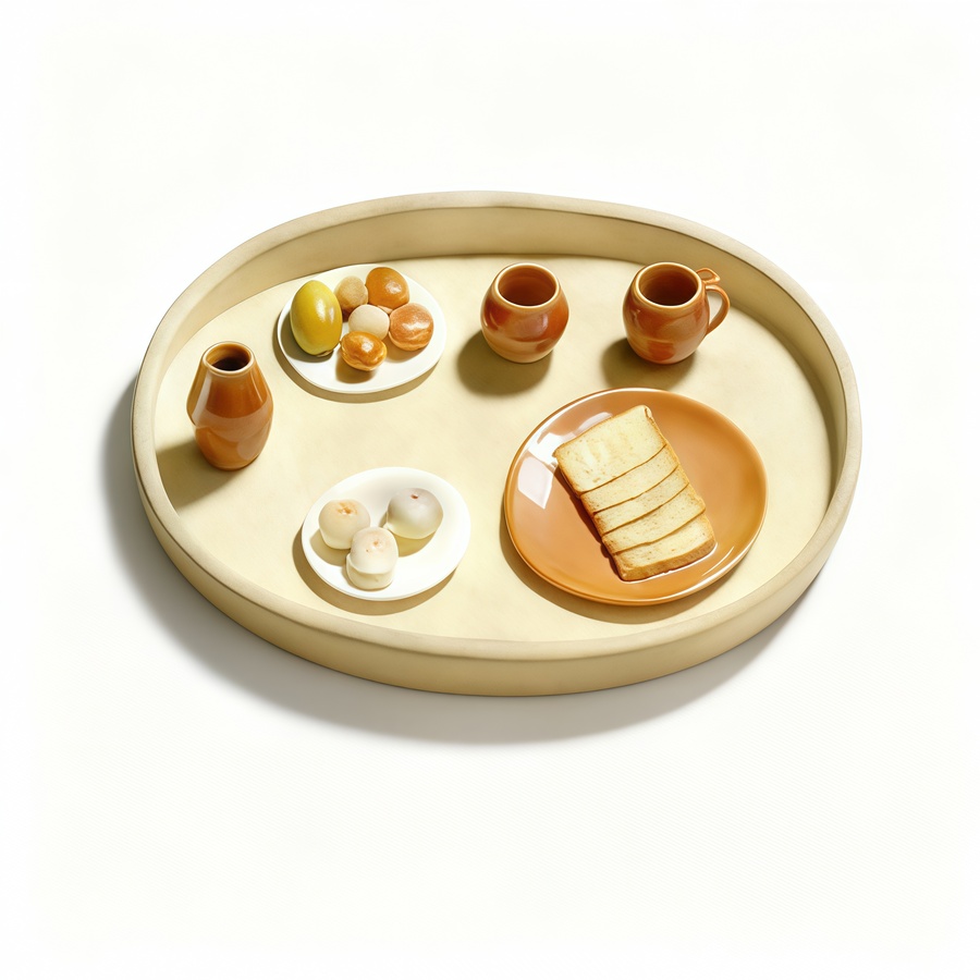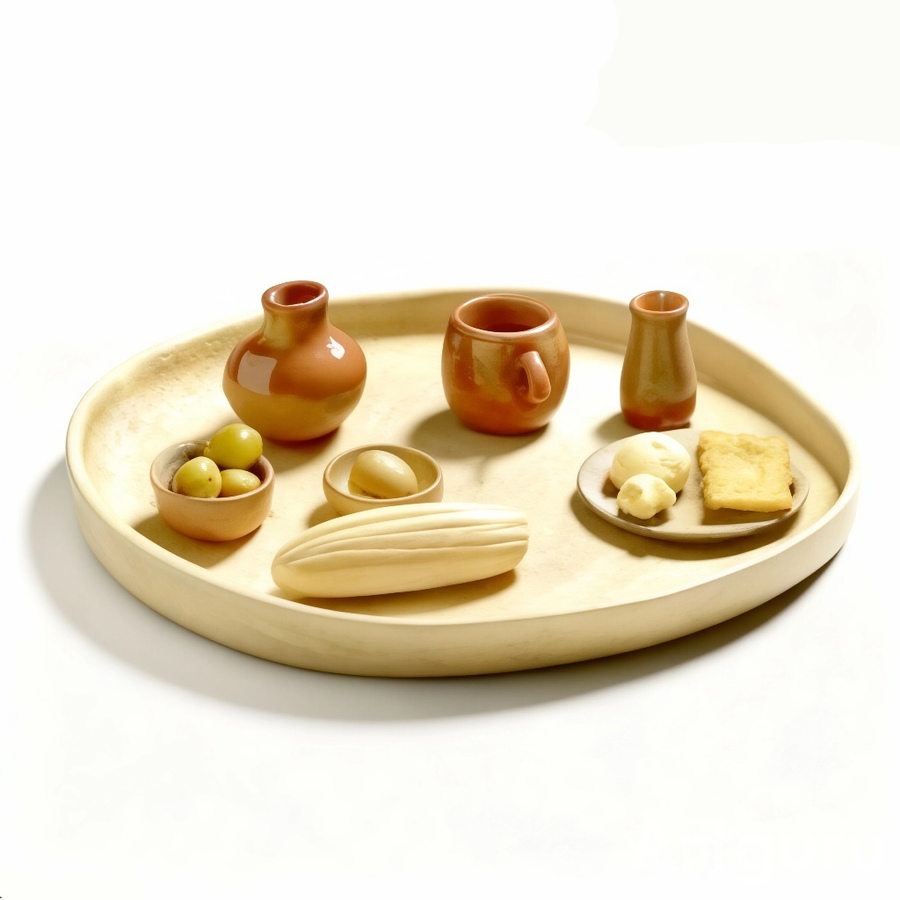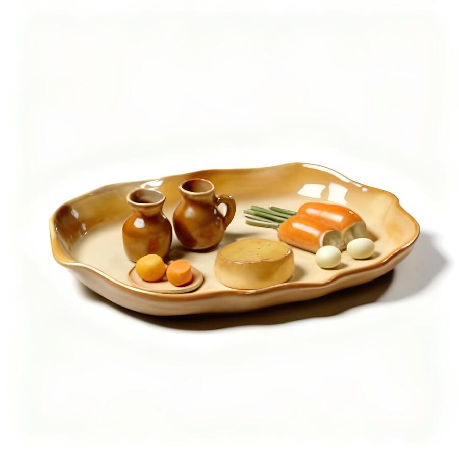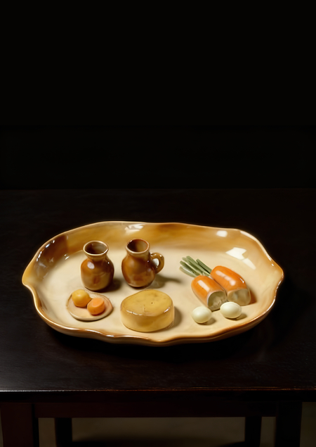 Все объекты серии объединены общими параметрами: материалом и схожей базовой формой. Круглая или вытянутая форма тарелки отсылает к идее стола как центра совместного действия и общения. Серийность строится не на изменении основы, а на вариативности наполнения — каждая тарелка отличается композицией, плотностью и набором объёмных элементов. В рельефе появляются хлеб, сосуды, овощи, рыба, зелень и другие традиционные атрибуты супры, но без изображения людей: человеческое присутствие ощущается опосредованно, через оставленные предметы и следы действия. В совокупности тарелки читаются как части одного большого застолья, словно взгляд перемещается от одного участка стола к другому. Серия работает на границе между утилитарным объектом и визуальным высказыванием, соединяя функциональность посуды с исследованием ритуала, памяти и коллективного опыта, зафиксированного в форме и материале