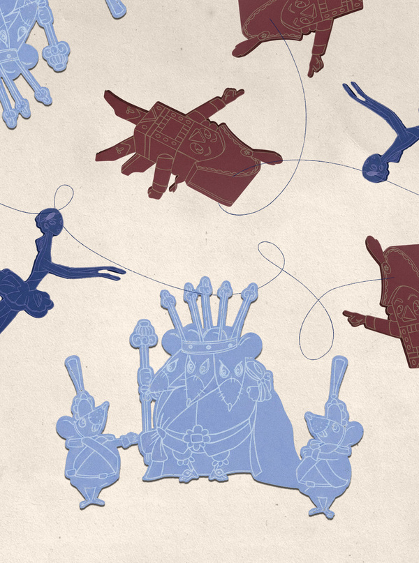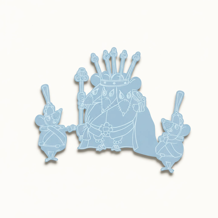 Промты: 1. Create a graphic silhouette of The Mouse King from the Soviet animated film «The Nutcracker» (1973) in USSR animation style. Use a soft matte gray or taupe color for the silhouette and add delicate, fine light-colored engraved outlines inside to define his crown, cape, and mischievous posture. Render as a thin, slightly 3D object on a neutral surface with soft drop shadows, emphasizing edges. Achieve a graphic, nostalgic, and slightly magical style. Negative prompt: cute mouse, realistic rodent, fur texture, flat color fill, gradient, dark outlines, thick black lines, photorealistic, 3D cartoon render, complex background, floating.