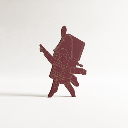3. Create a graphic silhouette of The Nutcracker from the Soviet animated film «The Nutcracker» (1973) in USSR animation style. Use a soft matte burgundy color for the silhouette and add delicate, fine light-colored engraved outlines inside to define his uniform, profile, and facial features. Render as a thin, slightly 3D object on a neutral surface with soft drop shadows, emphasizing edges. Achieve a graphic, nostalgic, and slightly magical style. Negative prompt: soldier, second character, flat color fill, gradient, dark outlines, thick black lines, wood texture, photorealistic, 3D cartoon render, complex background, floating, yellow border.