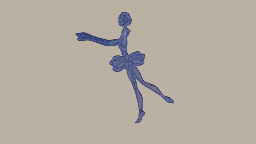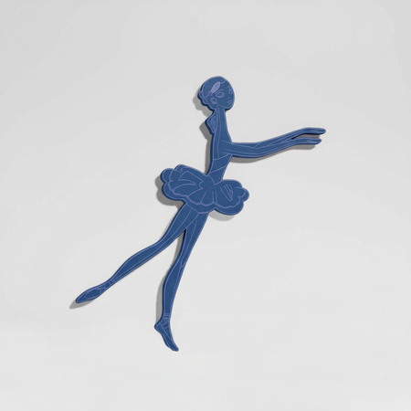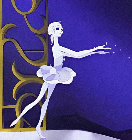 2. Create a graphic silhouette of The ballerina from the Soviet animated film «The Brave Tin Soldier» (1973) in USSR animation style. Use a soft matte blue color for the silhouette and add delicate, fine light-colored engraved outlines inside to define features and details. Render as a thin, slightly 3D object on a neutral surface with soft drop shadows, emphasizing edges. Achieve a graphic, nostalgic, and slightly magical style.