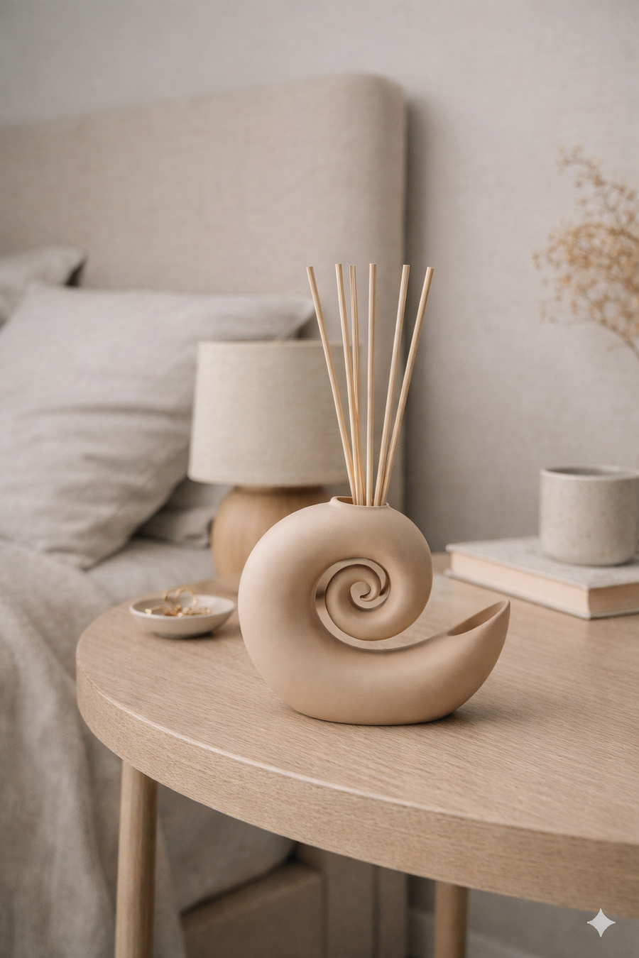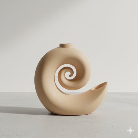 A minimalist marine-inspired aroma diffuser holder designed as an abstract seashell form. Smooth spiral geometry with softly flowing curves, no literal shell details, no ridges or ornaments. Central circular opening on top for an aroma diffuser stick or bottle. Matte ceramic surface, subtle imperfections, soft off-white or warm sand color. The object is photographed as a real physical product, studio lighting, soft shadows, neutral background. Calm, premium, contemporary interior design aesthetic. High realism, product photography style, no decorations, no text, no props.