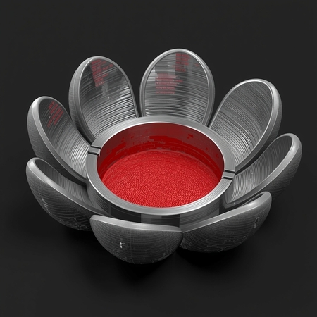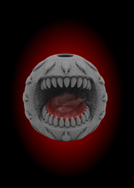 «A 3D model of a hookah against a white background. The hookah should be gray, look terrifying and frightening, with high detail and realistic 3D quality. Its shape should resemble a flower, with the hose appearing as a connection of several threads or fibers. The main color is gray, with some blood-red elements to give a horror and ominous mood. The model should be highly detailed, and the image should be presented as a collage of three different angles.»