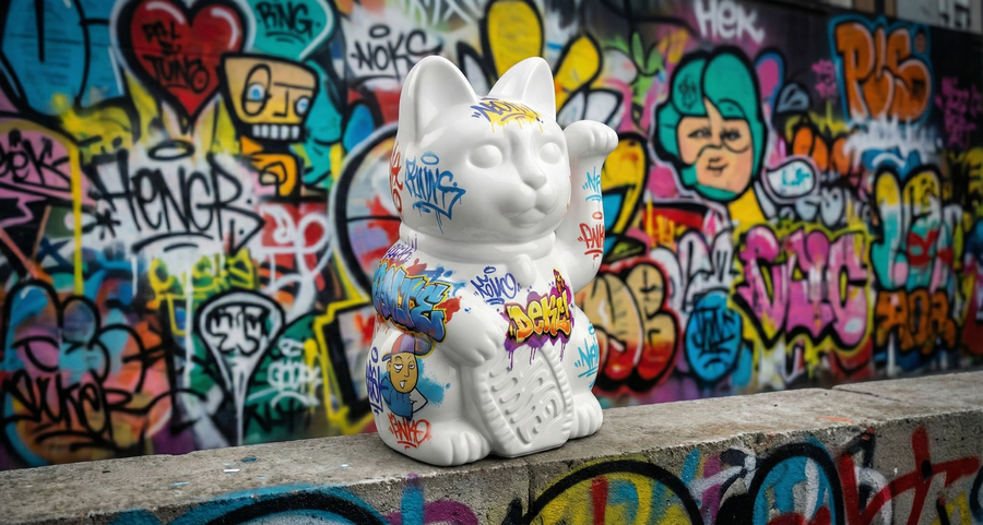 Make a figurine of chineese lucky cat made of plastic colored with graffiti, black background.