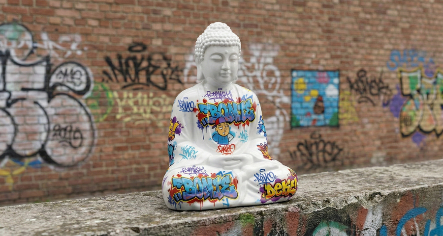 Make a figurine of Buddha made of plastic colored with graffiti, black background.