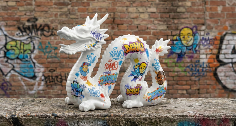 Make a figurine of chineese dragon made of plastic colored with graffiti, black background.