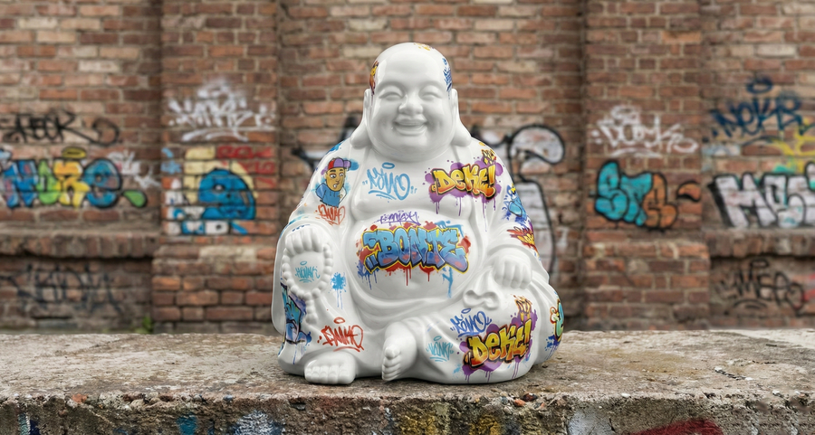 Make a figurine of chineese god of fortune Hotei made of plastic colored with graffiti, black background.