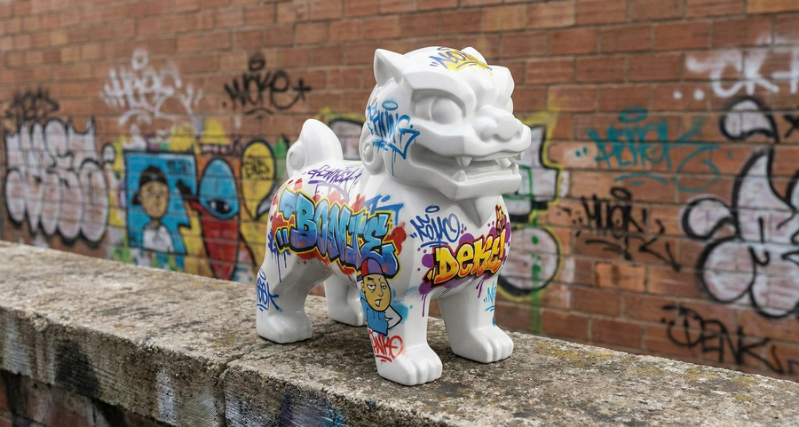 Make a figurine of chineese lion statue made of plastic colored with graffiti, black background.