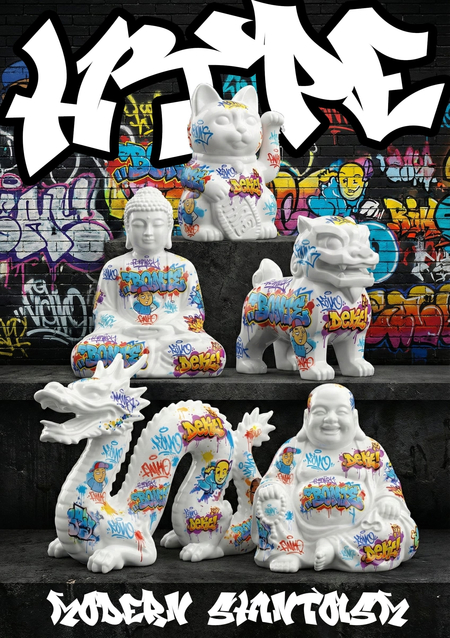 Это объединение современной эстетики с древними символами, которые вместе создают яркие и необычные сувениры. Эти фигурки включают в себя узнаваемые символы для туристов в Китае: льва-защитника, денежного кота, будду, хотэй и дракона.