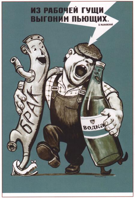 Плакатов, яро осуждающих курение, гораздо меньше чем тех, что осуждают алкоголизм. Очевидно это связано с тем, что человек в состоянии постоянного алкогольного опьянения не мог приносить пользу обществу, не мог «полноценно участвовать в строительстве социалистического общества» (1). Помимо этого он вредил как себе, так и окружающим его людям: семье, соседям, обычным прохожим.