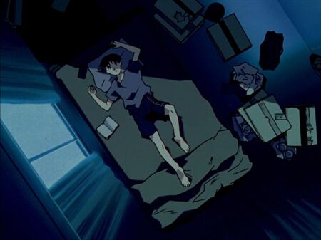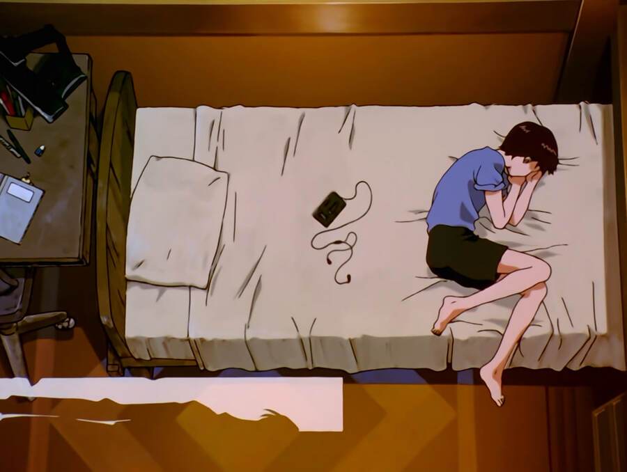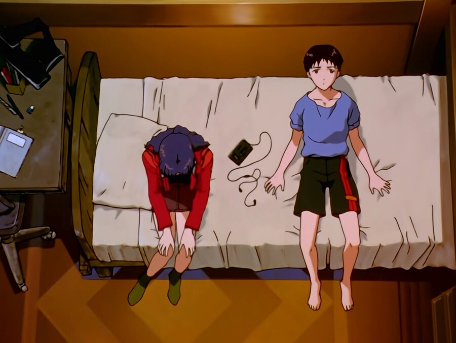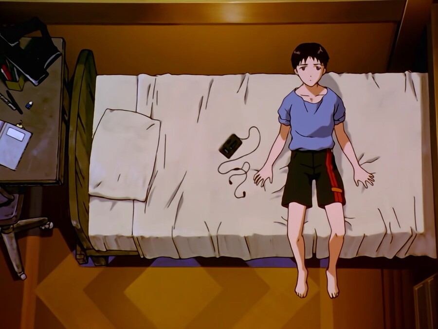 Комната главного героя Синдзи из «Евангелиона» почти полностью лишена индивидуальности: отсутствие личных предметов и нераспакованные коробки демонстрируют его постоянное чувство временности и неспособность «обосноваться» в собственном теле и жизни. Пространство становится отражением его эмоциональной закрытости — оно не жилое, а скорее функциональное, как временный приют. Здесь пространство демонстрирует не только одиночество, но и внутреннее нежелание формировать связь с внешним миром.