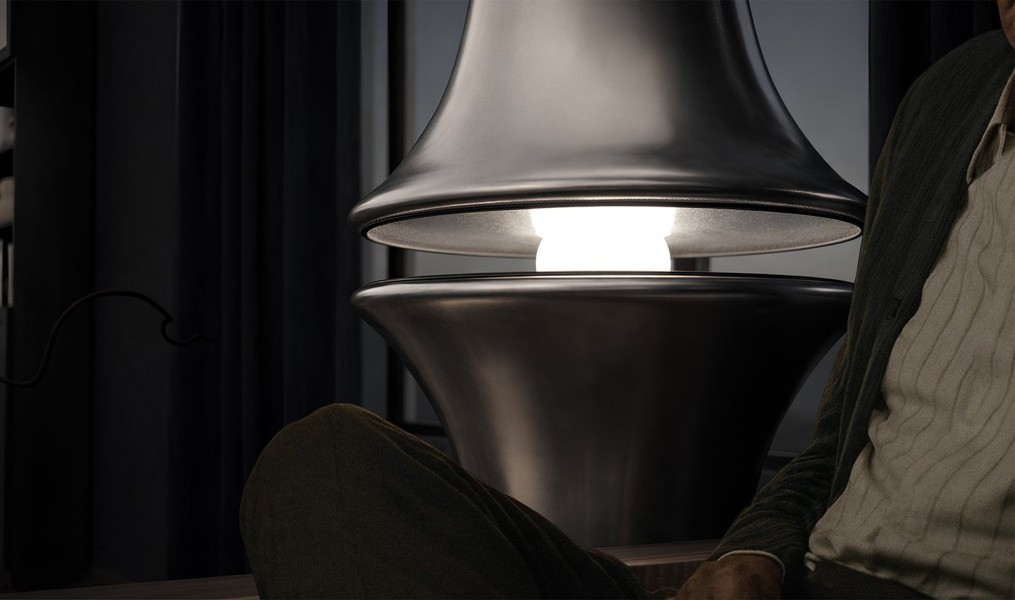 «Спутник» — напольный светильник-вояджер в эстетике ретрофутуризма. Движимый металлический объект, реагирующий на пользователя: подъем корпуса меняет световой сценарий. Проект о путешествии, утрате дома и поиске спутника через физическое взаимодействие с «живым» интерьером.
