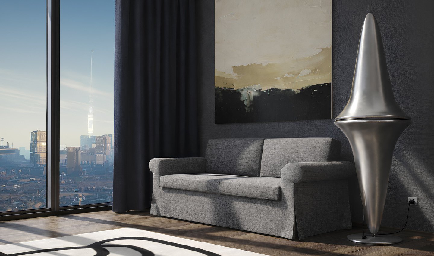 Футуристичная форма «Спутника», вдохновленная искусственными спутниками земли (ИСЗ, «Спутник-1», «Вояджер-1»), а также размер могут акцентировать на себе внимание, но стальная монохромность позволяет светильнику легко вписываться в любой интерьер.