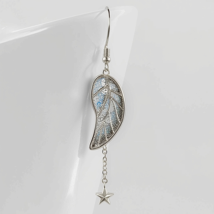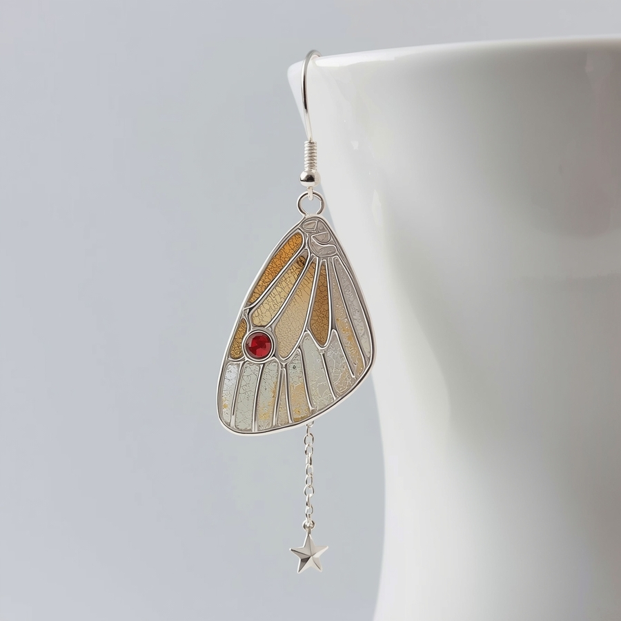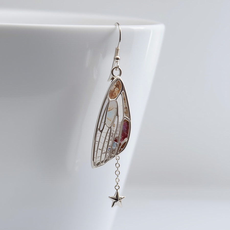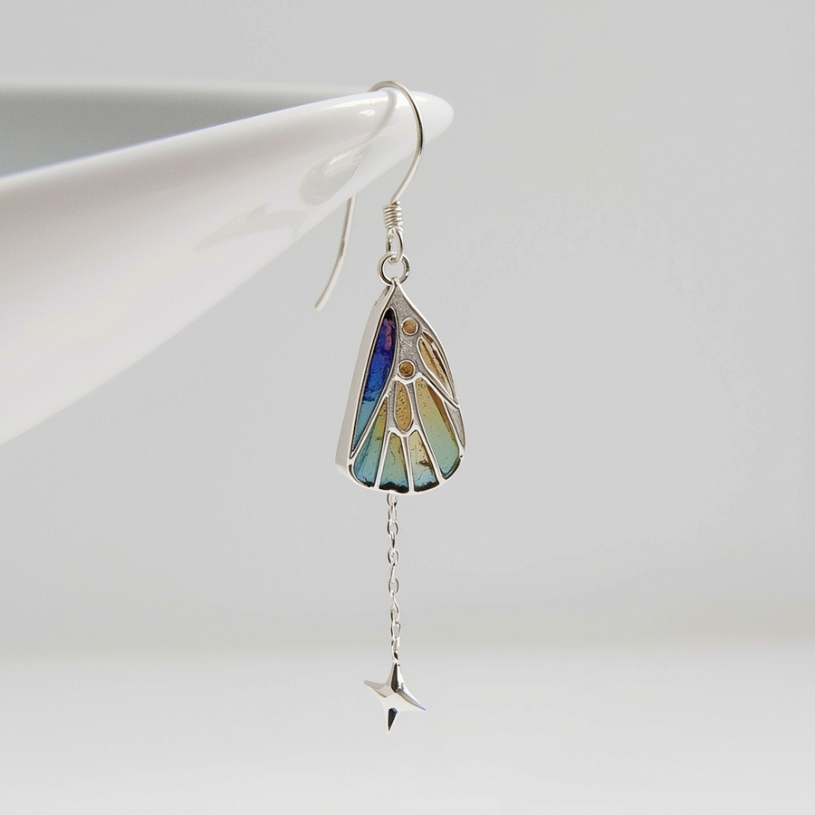 Промпт: Take a photo of the exquisite silver butterfly wing earring, featuring a delicate stained glass and silver wing with intricate details and a subtle sheen, suspended from a slender silver hook, with a dainty chain dangling from the bottom of the wing, terminating in a small, shiny silver star that adds a touch of celestial charm, against a clean and simple backdrop that allows the earring to be the focal point, with the silver and stained glass elements catching the light and showcasing their textured beauty.
