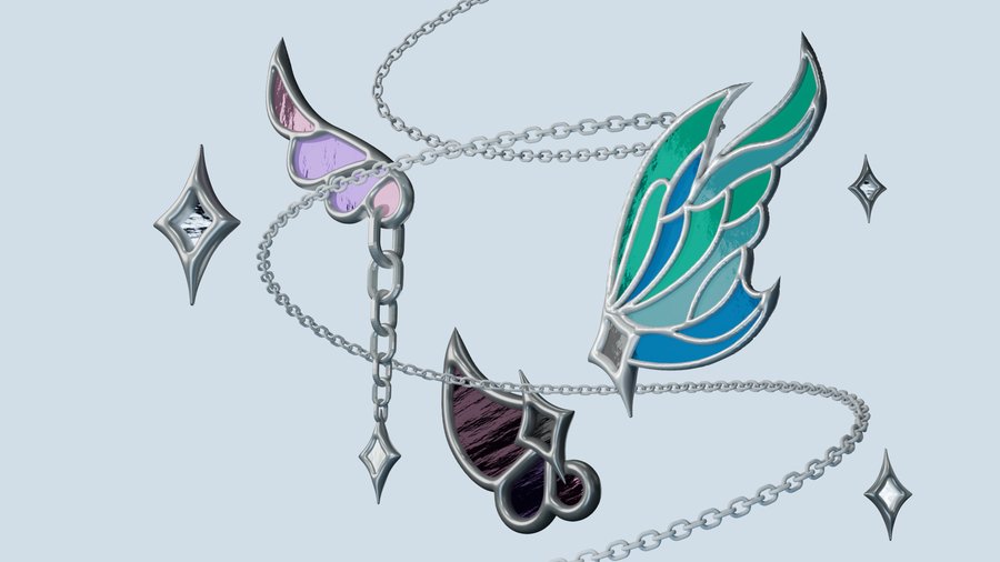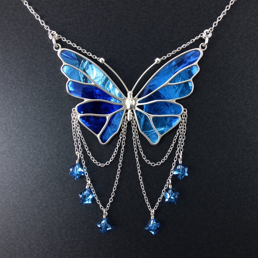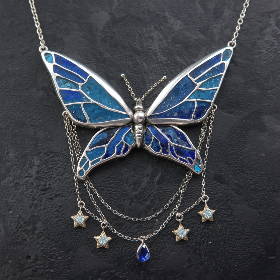 Промпт: Take a photo of the jewelry: a silver butterfly-wing necklace. The wings are made of stained glass and silver. The colors are blue. There are several levels of chains under the wings, and some of them have stars.