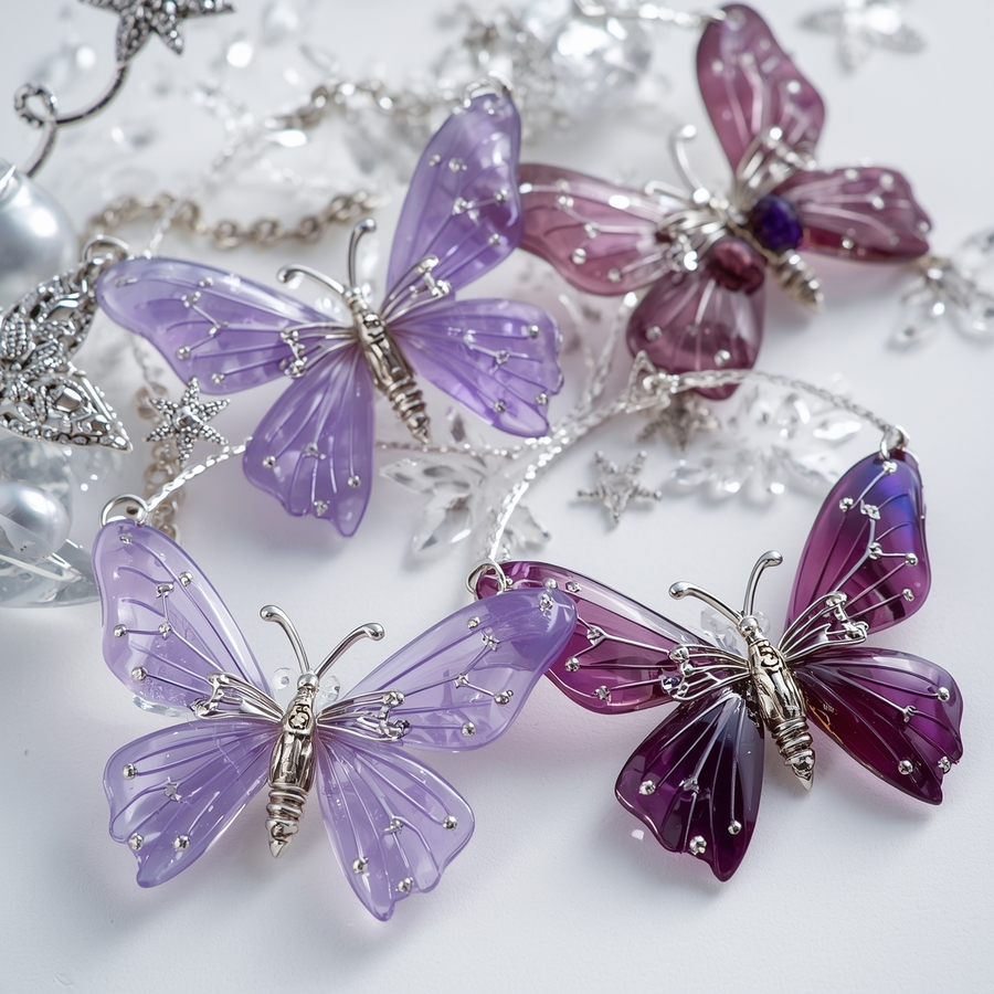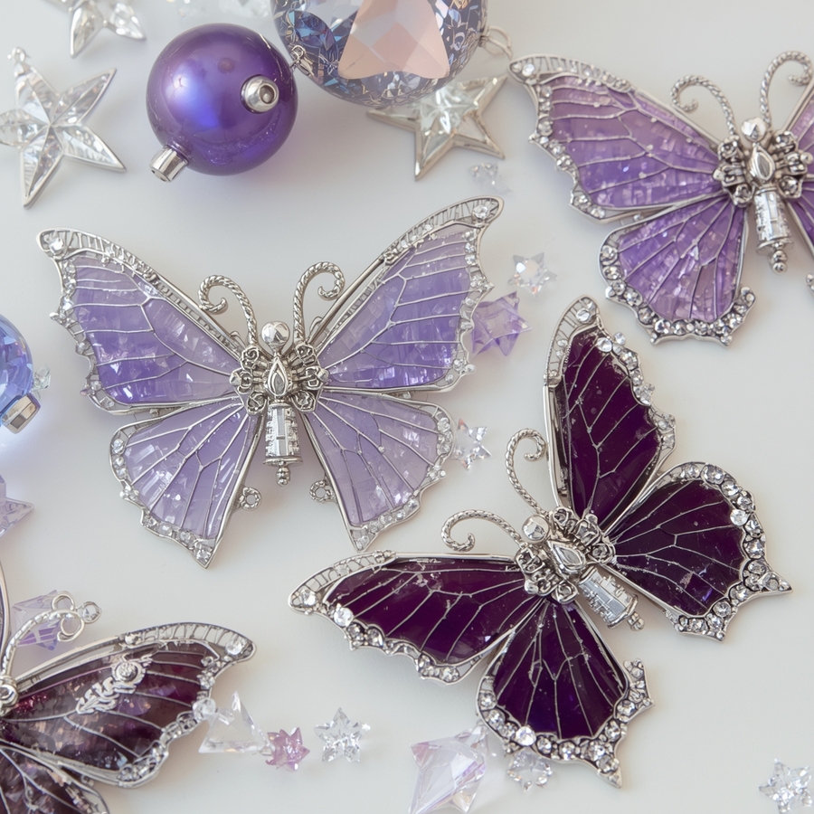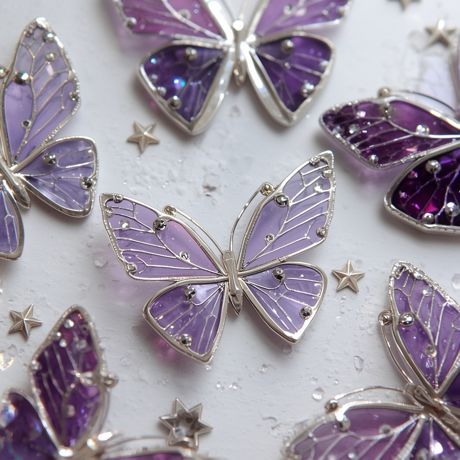 Промпт: Take the decoration: silver brooches in the shape of stars and butterfly wings. The wings are made of colored glass and silver. The colors are shades of purple.