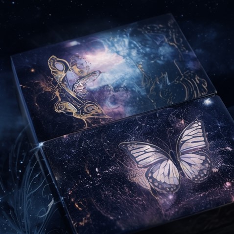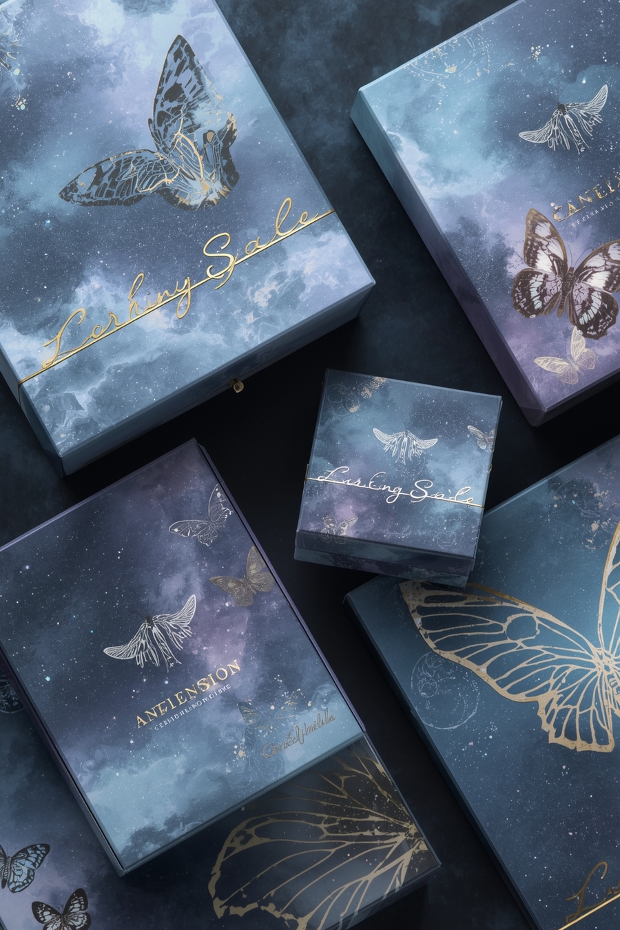 Промпт: Create several luxurious packaging designs for a jewelry brand that embody the elegance of butterfly wings and the mystery of space in soft boxes.