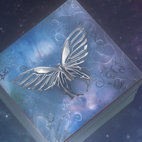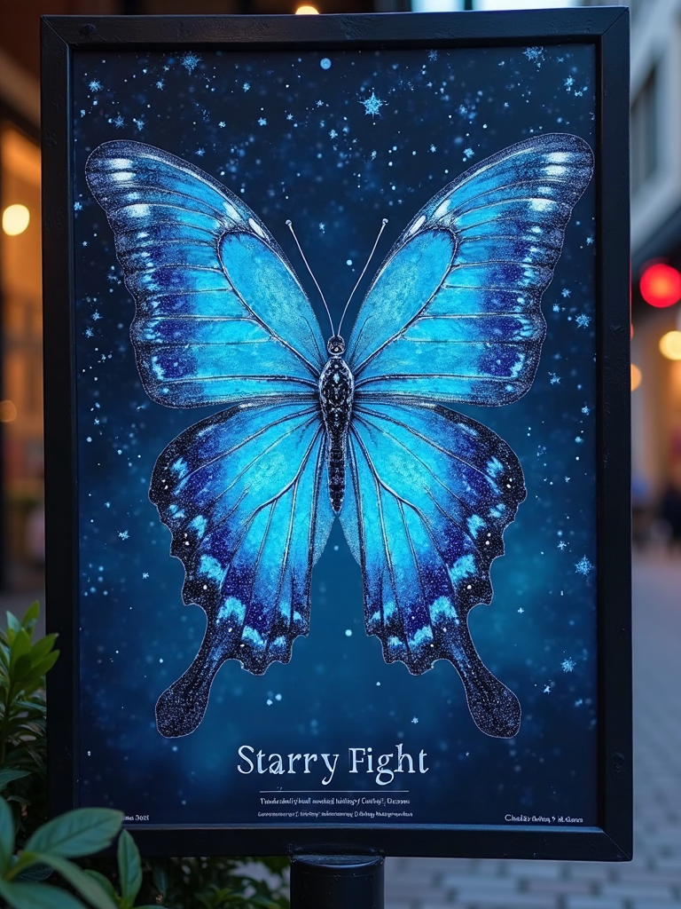 Промпт: Create posters for a jewelry brand. The poster features butterfly wings and a starry sky. Blue colors are present. The poster is titled Starry Fight. Finding the poster on the street