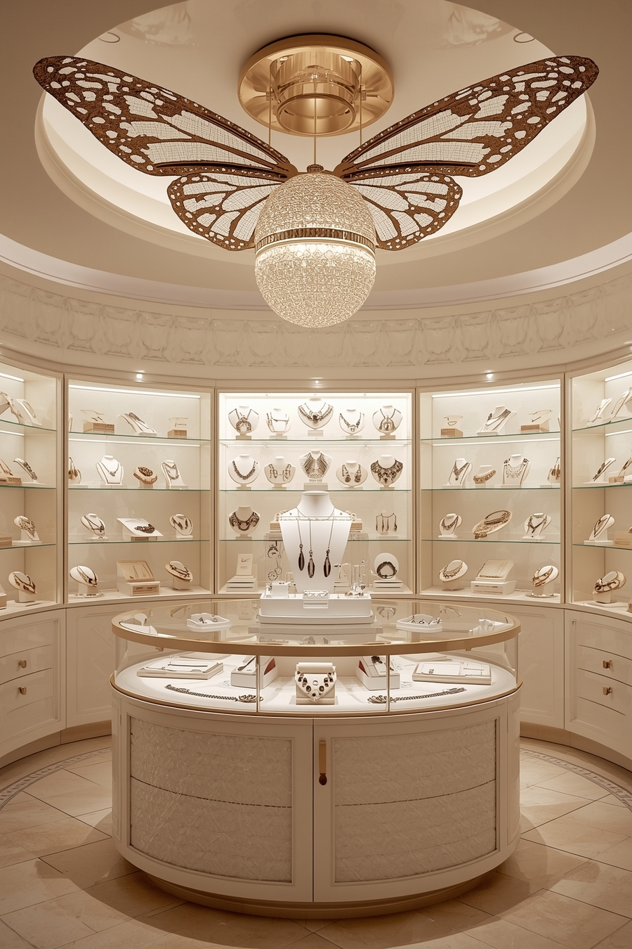 Промпт: Create a jewelry store. The style is space and butterfly wings. Let it be a bright room with design elements in the style. Let there be wings instead of a chandelier on the ceiling. There are boxes of jewelry on the shelves. There are no people