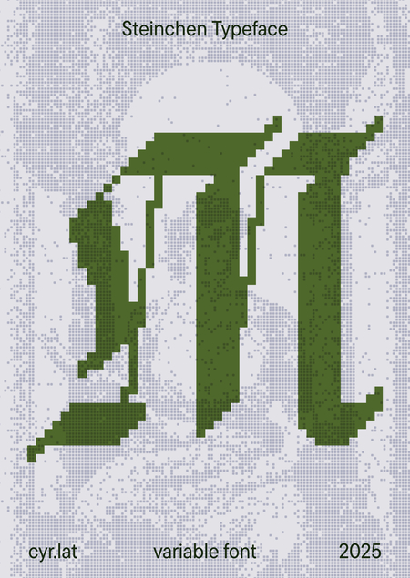 Steinchen Typeface — это готический вариативный шрифт. Его формообразование строится на напряжённых вертикалях и рубленых изломах — словно резцы каменщиков оставили след в букве.