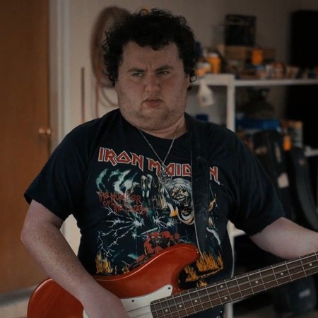 Его джинсы рваные, он носит джинсовку с различными нашивками в честь метал-групп, его волосы длинные и кудрявые.